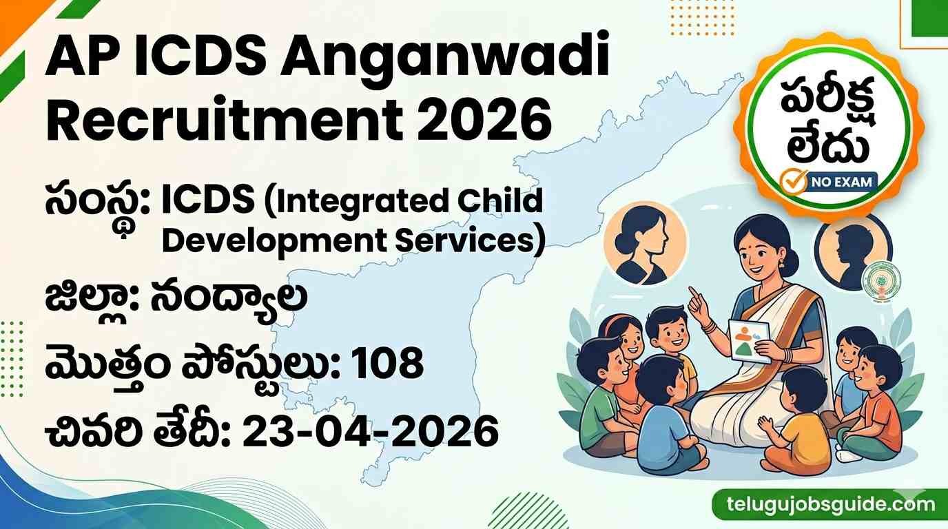 AP ICDS Anganwadi Recruitment 2026 నోటిఫికేషన్ విడుదలైంది. ఈ నోటిఫికేషన్ ద్వారా ఆంధ్రప్రదేశ్లోని నంద్యాల జిల్లా పరిధిలో అంగన్వాడీ టీచర్లు (Workers), మినీ అంగన్వాడీ వర్కర్లు మరియు అంగన్వాడీ ఆయా పోస్టులకు దరఖాస్తులు ఆహ్వానిస్తున్నారు.