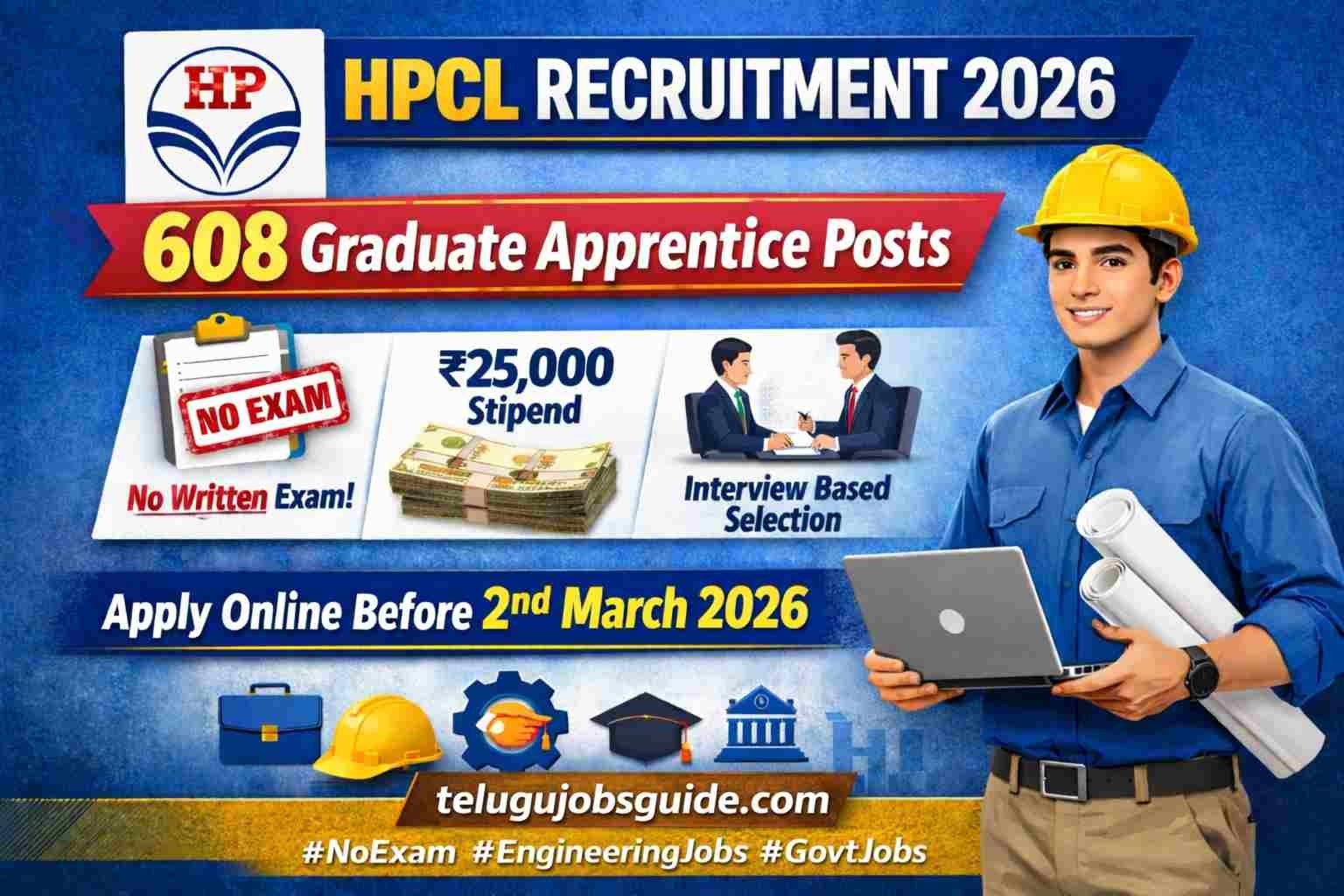 Hindustan Petroleum Corporation Limited (HPCL) 2026 సంవత్సరానికి సంబంధించిన Graduate Apprentice Trainee నియామక ప్రకటనను విడుదల చేసింది. ఇంజినీరింగ్ పూర్తి చేసిన అభ్యర్థులు ప్రభుత్వ రంగ సంస్థలో కెరీర్ ప్రారంభించాలనుకుంటే ఇది మంచి అవకాశం. దేశవ్యాప్తంగా మొత్తం 608 గ్రాడ్యుయేట్ అప్రెంటిస్ పోస్టులను భర్తీ చేయనున్నారు. ముఖ్యంగా లిఖిత పరీక్ష లేకుండా కేవలం ఇంటర్వ్యూ ఆధారంగా ఎంపిక జరుగుతుంది.
