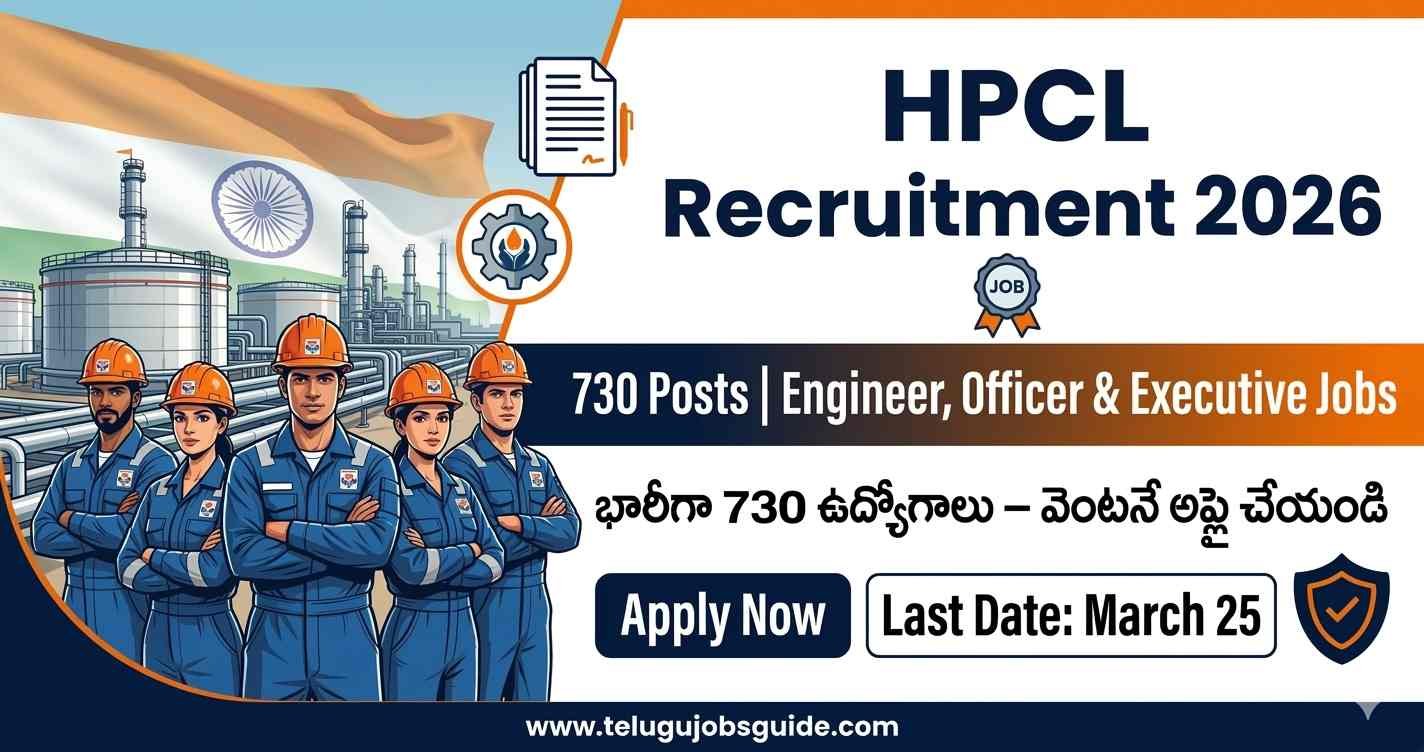 ప్రభుత్వ రంగంలో మంచి జీతంతో స్థిరమైన ఉద్యోగం కోసం ఎదురుచూస్తున్న వారికి గొప్ప అవకాశం వచ్చింది. Hindustan Petroleum Corporation Limited (HPCL) 2026 సంవత్సరానికి సంబంధించిన తాజా నోటిఫికేషన్ విడుదల చేసి, Junior Executive, Engineer, Officer మరియు ఇతర పోస్టులకు మొత్తం 730 ఖాళీలు ప్రకటించింది.