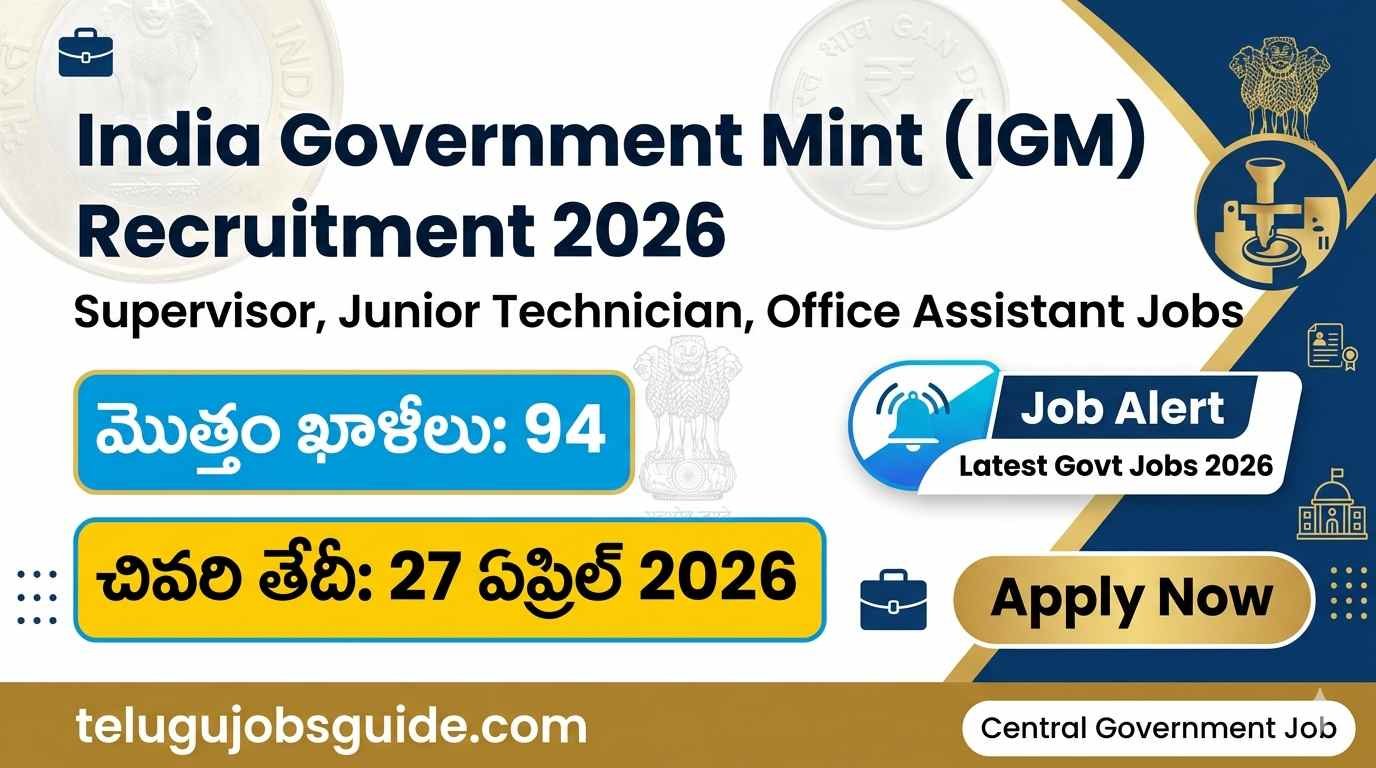 ప్రభుత్వ ఉద్యోగాల కోసం ఎదురు చూస్తున్న అభ్యర్థులకు ఇది గొప్ప అవకాశం. India Government Mint (IGM) 2026 నియామక ప్రకటన విడుదల చేసింది. మొత్తం 94 ఖాళీలకు అర్హులైన అభ్యర్థుల నుండి ఆన్లైన్ దరఖాస్తులు ఆహ్వానిస్తోంది.