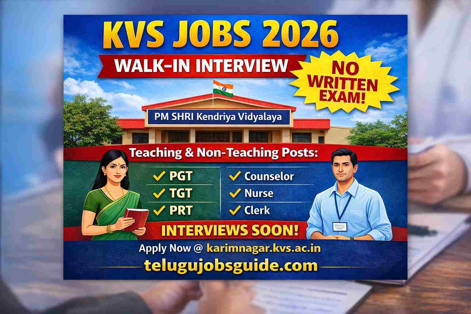 ప్రభుత్వ పాఠశాలలో ఉద్యోగం కోరుకునే అభ్యర్థులకు అద్భుత అవకాశం. PM SHRI Kendriya Vidyalaya లో 2026–27 విద్యా సంవత్సరానికి గాను టీచింగ్ మరియు నాన్-టీచింగ్ పోస్టుల భర్తీకి వాక్-ఇన్ ఇంటర్వ్యూ నోటిఫికేషన్ విడుదలైంది. ఈ రిక్రూట్మెంట్లో రాత పరీక్ష లేకుండా నేరుగా ఇంటర్వ్యూ ద్వారా ఎంపిక చేయనున్నారు.