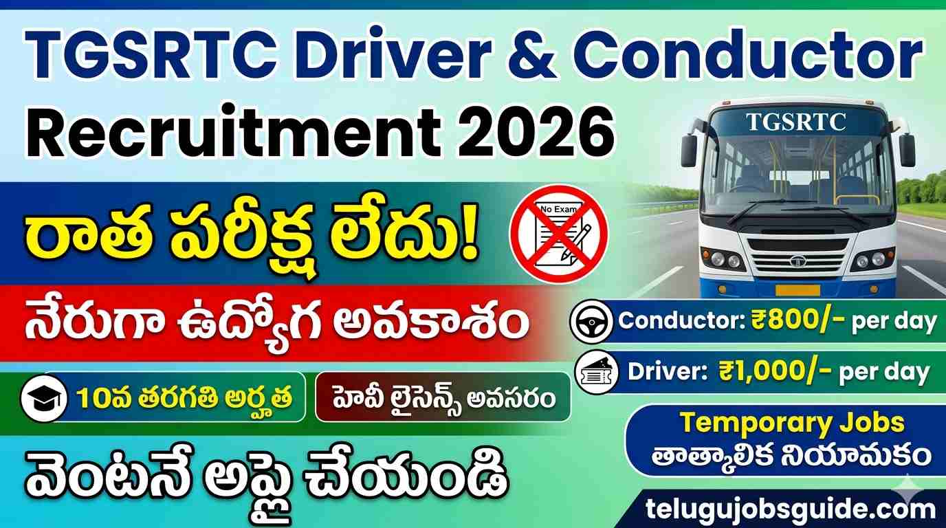 TGSRTC Driver & Conductor Recruitment 2026 – రాత పరీక్ష లేకుండా ఉద్యోగ అవకాశం | ₹1000 డ్రైవర్, ₹800 కండక్టర్ జీతం