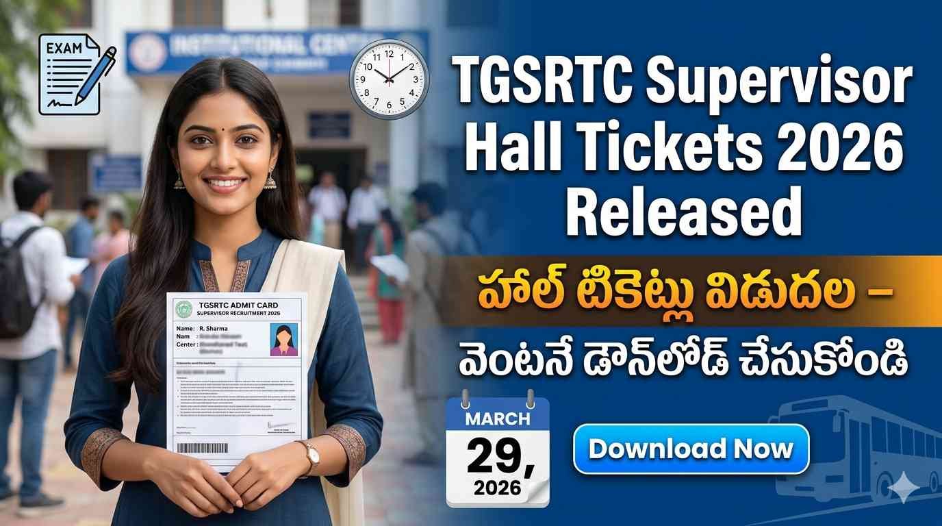 తెలంగాణలో ప్రభుత్వ ఉద్యోగాల కోసం ఎదురుచూస్తున్న అభ్యర్థులకు శుభవార్త. TGSRTC Supervisor Recruitment 2026 కి సంబంధించిన రాత పరీక్ష హాల్ టికెట్లు అధికారికంగా విడుదల అయ్యాయి. పరీక్షకు హాజరయ్యే అభ్యర్థులు వెంటనే తమ హాల్ టికెట్ను డౌన్లోడ్ చేసుకోవాలి.